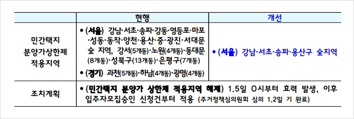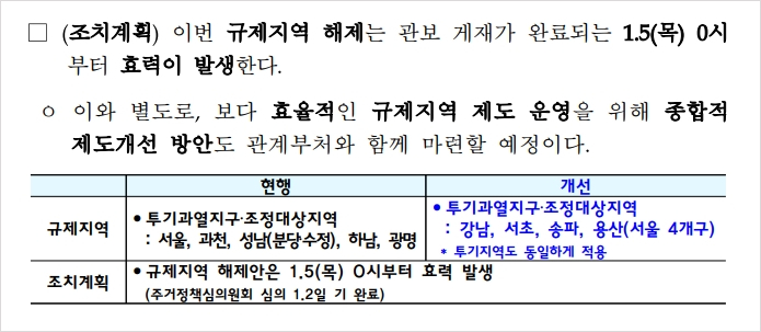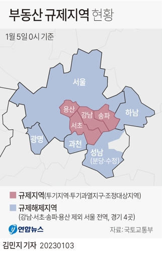 이번 규제지역 해제안으로 2023년 1월 5일 0시부터는 서울 강남 3구(강남, 서초, 송파) 및 용산을 제외한 전 지역이 투기과열지구, 조정대상지역, 투기지역에서 전면 해제된다.