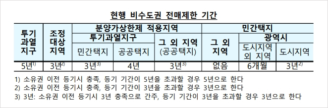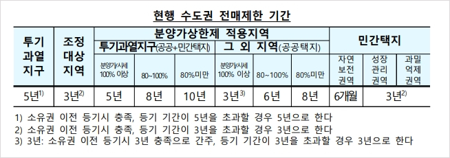 (수도권) 공공택지(분양가 상한제 적용) 및 규제지역은 3년, 과밀억제권역 1년, 그 외 지역 6개월