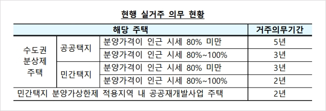 개인의 거주이전의 자유를 제약한다는 비판과 함께 수요가 많은 신축임대 공급을 위축시킨다는 지적 등이 제기되어 왔던 만큼, 이번 민간주택 분양가 상한제 적용지역 해제와 더불어 실거주 의무 또한 폐지된다.