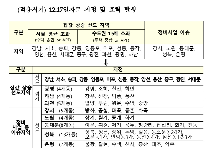 현재 서울 전 지역, 과천, 성남(수정구, 분당구), 하남, 광명이 투기과열지구 및 조정대상지역으로 지정되어 있다. 이 중 서울 15개구(강남, 서초, 송파, 용산, 성동, 노원, 마포, 양천, 강서, 영등포, 강동, 종로, 중, 동대문, 동작)는 주택 투기지역으로도 지정되어 있다.