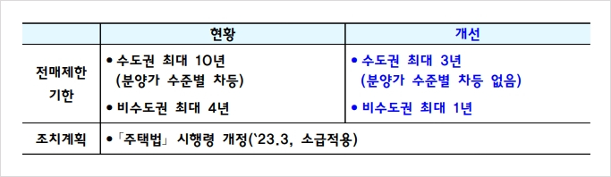 규제 수준이 과도하고 복잡해 이해가능성이 떨어지는 현행 제도를 개선하기 위해 전매제한 기간을 완화하고, 복잡한 관련 규정을 아래와 같이 간소화한다. 시행령 개정 이전 분양받은 경우라도 개정 시행령을 소급 적용해 완화된 규정이 적용된다.