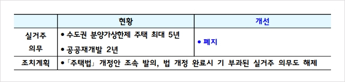 개인의 거주이전의 자유를 제약한다는 비판과 함께 수요가 많은 신축임대 공급을 위축시킨다는 지적 등이 제기되어 왔던 만큼, 이번 민간주택 분양가 상한제 적용지역 해제와 더불어 실거주 의무 또한 폐지된다.