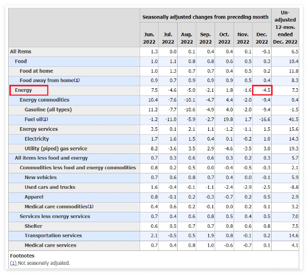 미국 내 물가 수준을 가늠할 수 있는 대표적인 게 소비자물가지수 CPI 발표다. 우리나라 기준 2023년 1월 12일 저녁 10시 30분에 2022년 12월 미국 CPI가 발표되었는데, 예상치 6.5%에 부합하는 결과가 나왔다. 아래 표에서 보이듯 유가 등 에너지 물가 하락폭의 영향이 컸다는 것을 알 수 있다.