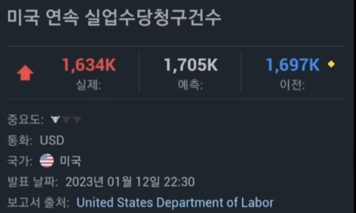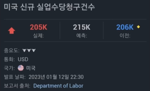 위 차트에서 보면 2023년 1월 12일 장 초반에 급락이 나온 것을 알 수 있는데, 그 연유로 미국 CPI 발표와 같은 날 같은 시각 발표된 미국 실업수당청구건수를 꼽는다.