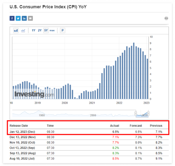 미국 내 물가 수준을 가늠할 수 있는 대표적인 게 소비자물가지수 CPI 발표다. 우리나라 기준 2023년 1월 12일 저녁 10시 30분에 2022년 12월 미국 CPI가 발표되었는데, 예상치 6.5%에 부합하는 결과가 나왔다. 아래 표에서 보이듯 유가 등 에너지 물가 하락폭의 영향이 컸다는 것을 알 수 있다.