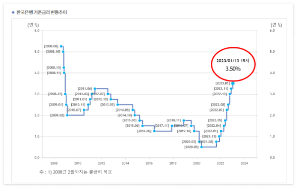 한국은행 기준금리가 3.5%에 도달했다. 2023년 1월 13일 열린 한국은행 금융통화위원회 통화정책방향 회의에서 다시 한번 기준금리 인상이 결정됐다. 이번 인상폭 역시 지난번과 마찬가지로 0.25%p 올라 한국은행 기준금리는 기존 3.25%에서 3.5%가 됐다.