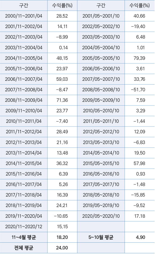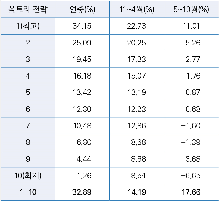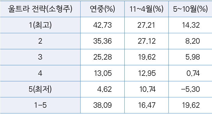 이 책에서는 계절성(Seasonality, 11-4월 투자 실적이 5-10월 대비 월등함)과 소형주 효과(시가총액 하위 20% 적용 시 수익률 급등)를 거듭 강조하는데, 위 울트라 전략에 적용 시 아래와 같이 수익률이 급상승한 백테스트 결과를 보임.