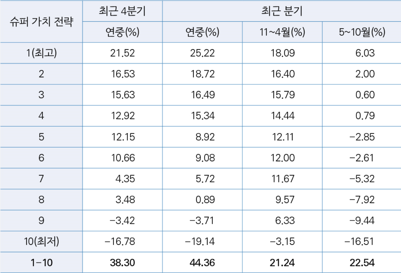 ※ 신F-스코어: ① 전년 신규 주식 발행 없음, ② 수익 > 0, ③ 영업현금흐름 > 0, 해당되면 각각 1점씩