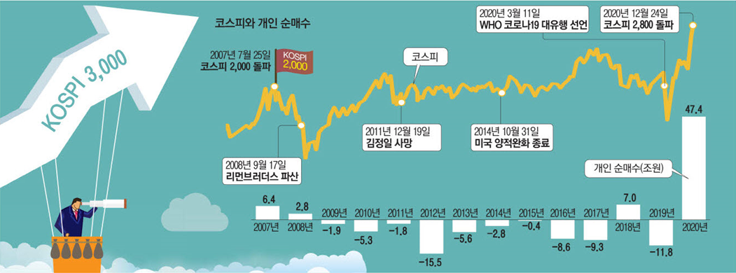 지난해 개인투자자의 코스피 순매수 규모는 무려 47조4905억원, 이는 '박스피' 장세로 일컬어지는 2007년~2019년 개인투자자들의 순매도 금액(13년간 누적)인 47조25억원을 상회하는 수치다.