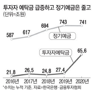 개인 자금이 증시로 대거 이동한 것은 전통적 금융자산인 은행 예금이 더 이상 부의 축적 수단으로 유효하지 않기 때문. 한국은행에 따르면 시중은행의 1년 만기 정기예금 금리는 2012년 3.71%에서 지난해 11월 말 1.02%까지 하락했다.