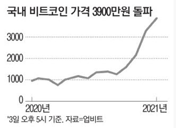 국내 가상화폐 거래소 업비트에 따르면 3일 16시 30분 기준 비트코인 가격이 장중 3900만원을 돌파했다. 국내 거래소 최초로 3000만원대를 기록한 지난달 27일 이후 일주일 만에 가격이 900만원 이상 오른 셈.