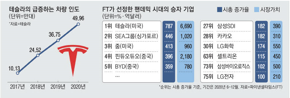 테슬라의 승승장구를 파이낸셜타임스(FT)도 주목했다. 이날 FT는 테슬라를 팬데믹 속에서 승리한 100대 기업 가운데 1위로 꼽았다. 테슬라는 5분기 연속 실적 호조세를 바탕으로 주가가 급등했다. 지난해 6월 이후 테슬라 주가는 787% 증가했다.