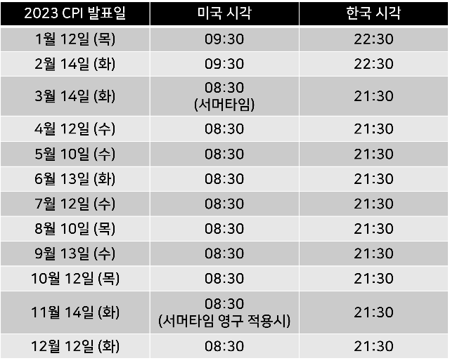 미국 고용통계국(U.S. Bureau of Labor Statistics; BLS)에서 매달 발표하는 CPI 소비자물가지수는 1년 전에 발표일을 미리 정해 공지한다. 매달 10~13일 사이에 발표되며 2023년 미국 CPI 발표 시은 아래와 같다.