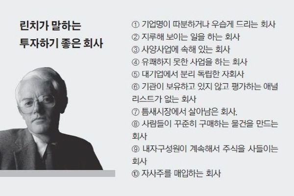 - 자산주: '월가 사람들'은 모르지만 개인들은 알 수 있는, 현장에 대한 강점이 가장 큰 힘을 발휘할 수 있는 주식. 자산 보유 회사에 대한 실용적인 지식과 주가에 반영되기까지의 인내심이 요구됨.