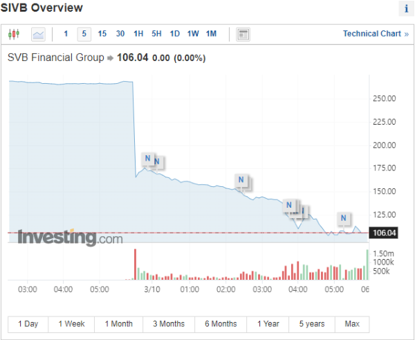 기술주 중심의 나스닥에 상장되어 있는 SVB는 이 소식으로 200-300불대에서 움직이던 주가가 순식간에 폭락하며 106.04불을 기록했고, 이어 해당 주식의 거래가 정지됐다.