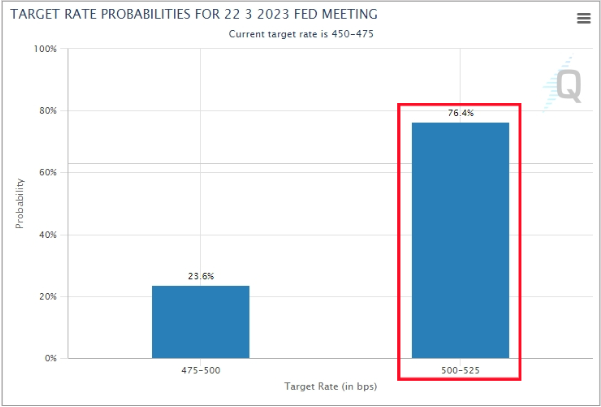 때문에 FedWatch에서 3월 FOMC 일정 미국 금리인상 전망치에 무려 '금리 동결'이 보인다. 일주일 전만 하더라도 빅스텝(0.5%p) 인상이 유력했던 미국 금리인상 전망치가 베이비스텝(0.25%p)는 당연시되고 0% 동결 예상치가 생겨난 것.