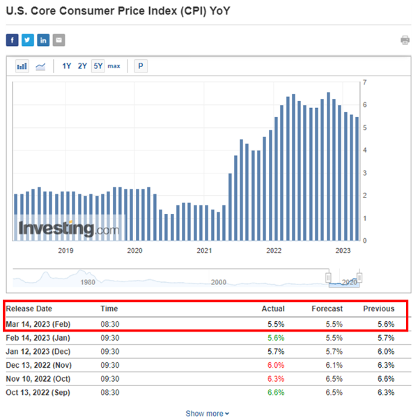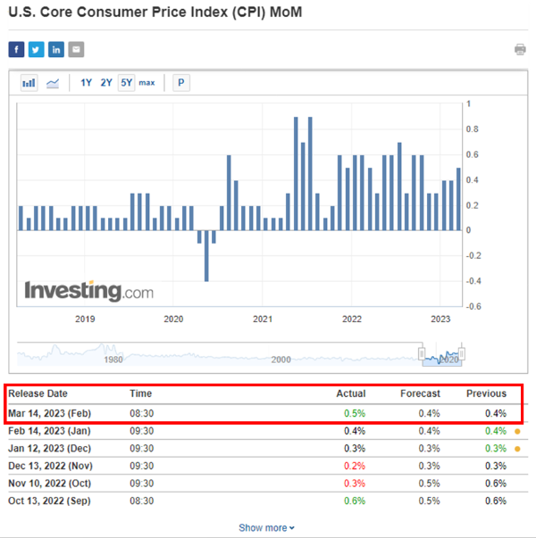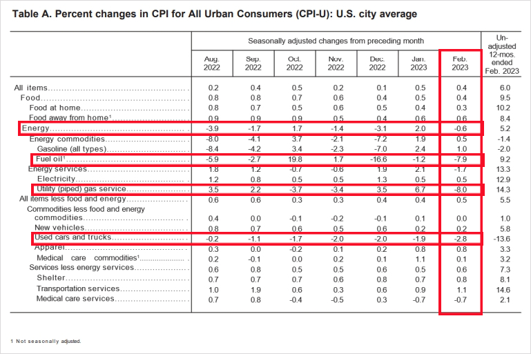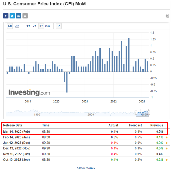 SVB 파산으로 미국 금리인상 중단 시나리오까지 나온 만큼 연준 입장에서는 인플레이션 상황이 관건이었을텐데, 간밤에 가장 중요한 경제 지표였던 2월의 미국 CPI 소비자물가지수가 발표됐다. 미국 시간으로는 3월 14일 오전 8시 30분, 한국 시간으로는 같은 날 오후 9시 30분.