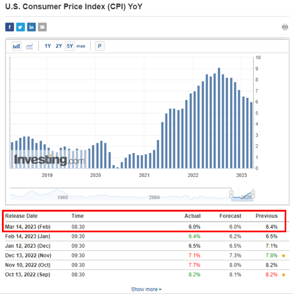 SVB 파산으로 미국 금리인상 중단 시나리오까지 나온 만큼 연준 입장에서는 인플레이션 상황이 관건이었을텐데, 간밤에 가장 중요한 경제 지표였던 2월의 미국 CPI 소비자물가지수가 발표됐다. 미국 시간으로는 3월 14일 오전 8시 30분, 한국 시간으로는 같은 날 오후 9시 30분.
