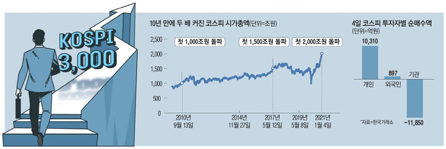 코스피 시총 2000조 넘어, 10년 3개월만에 두배로 (애플 시총은 2441조원)