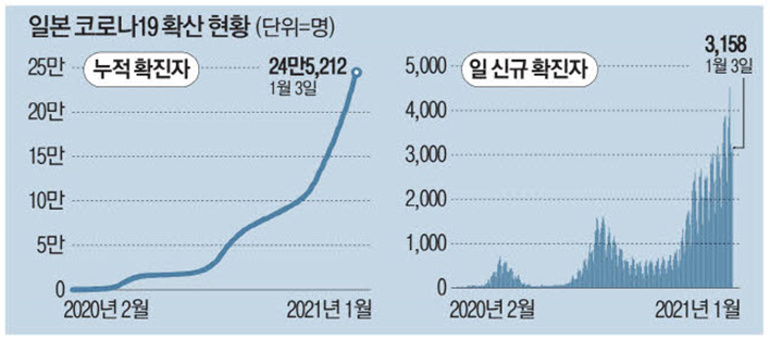 일본 정부가 코로나19 확산세를 막기 위해 수도권(도쿄, 가나자와, 지바, 사이타마)에 대해 '긴급사태'를 선포하는 방안을 검토한다. 이번주 긴급사태를 선언할 것이라는 전망이 많이 나오는 가운데 오는 9일부터 한 달여간 긴급사태가 유지될 것이라는 예측이 나온다. 백신은 2월 하순께 접종이 가능하도록 준비중이다.