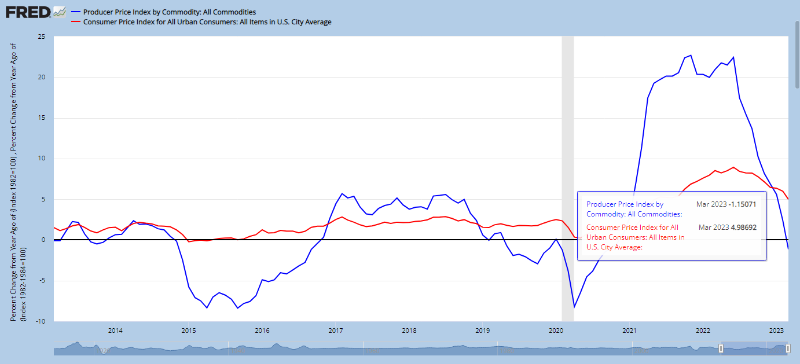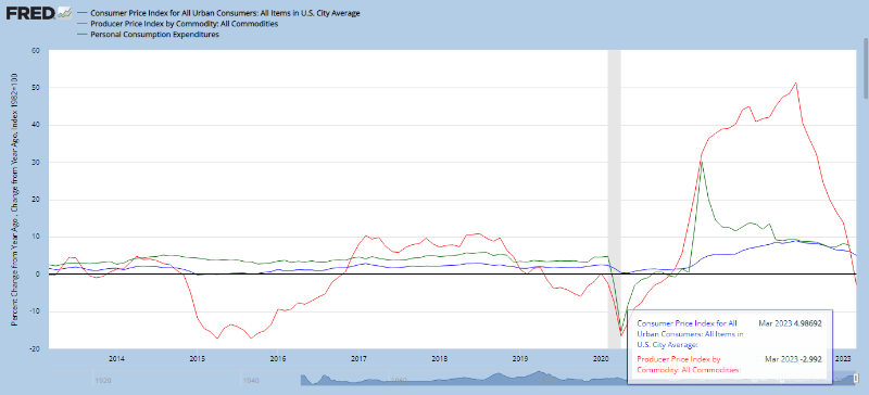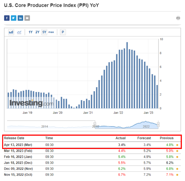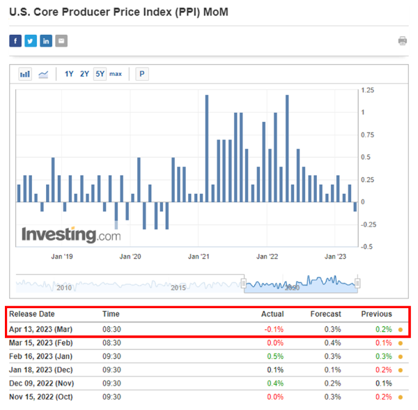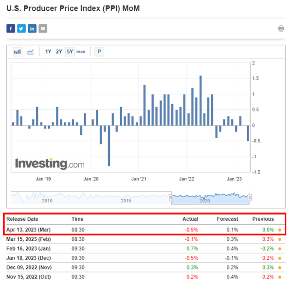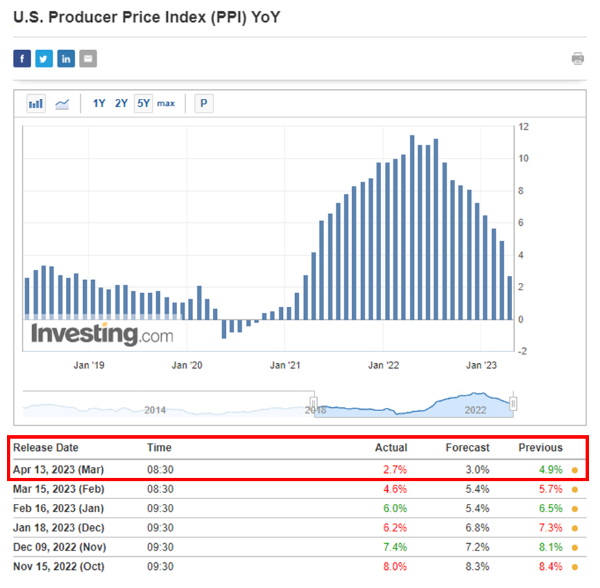 CPI와 마찬가지로 미국 고용통계국(BLS)에서 발표하는 미국 PPI 생산자물가지수 3월분 지표가 CPI 발표 다음날인 4월 13일에 발표되었는데요. 예상치보다도 더 큰 서프라이즈로 인플레이션이 꺾이는 모습이 드러났습니다.