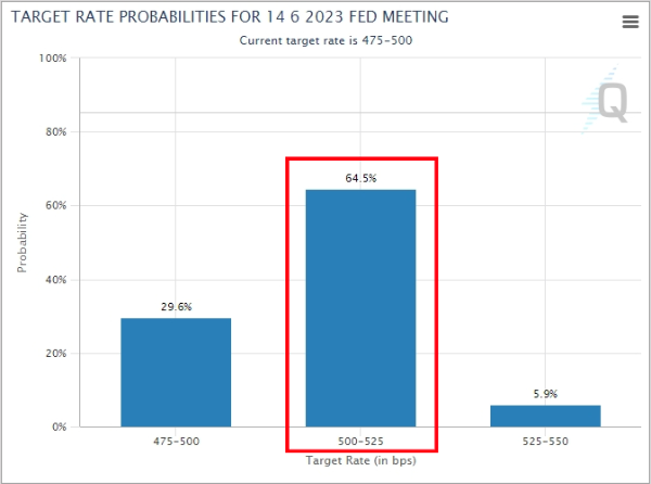 일단 5, 6월 FOMC에선 기준금리를 0.25%p 한 번은 더 올린다는 전망이 우세합니다. 하지만 미국 금리인상 사이클은 기준금리 5.25%를 정점으로 종료될 거란 전망이 우세합니다.