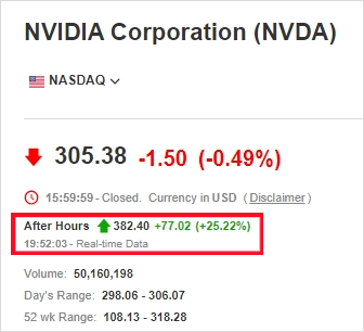 그 결과 5월 24일 미 증시 본장에서는 약보합으로 마무리한 엔비디아의 주가가 시간외 거래에서는 최대 28%까지 급등하며 380달러 선을 웃도는 수준으로 거래가 진행되고 있습니다.