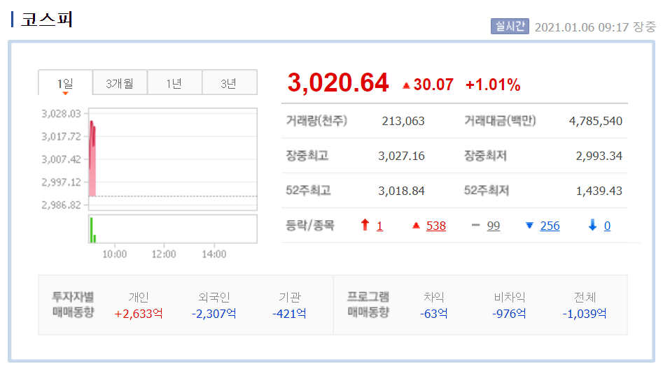 | (1/5화 경제뉴스) 2021년 첫 거래일, 코스피 3000 눈앞 (0) | 2021.01.05 |